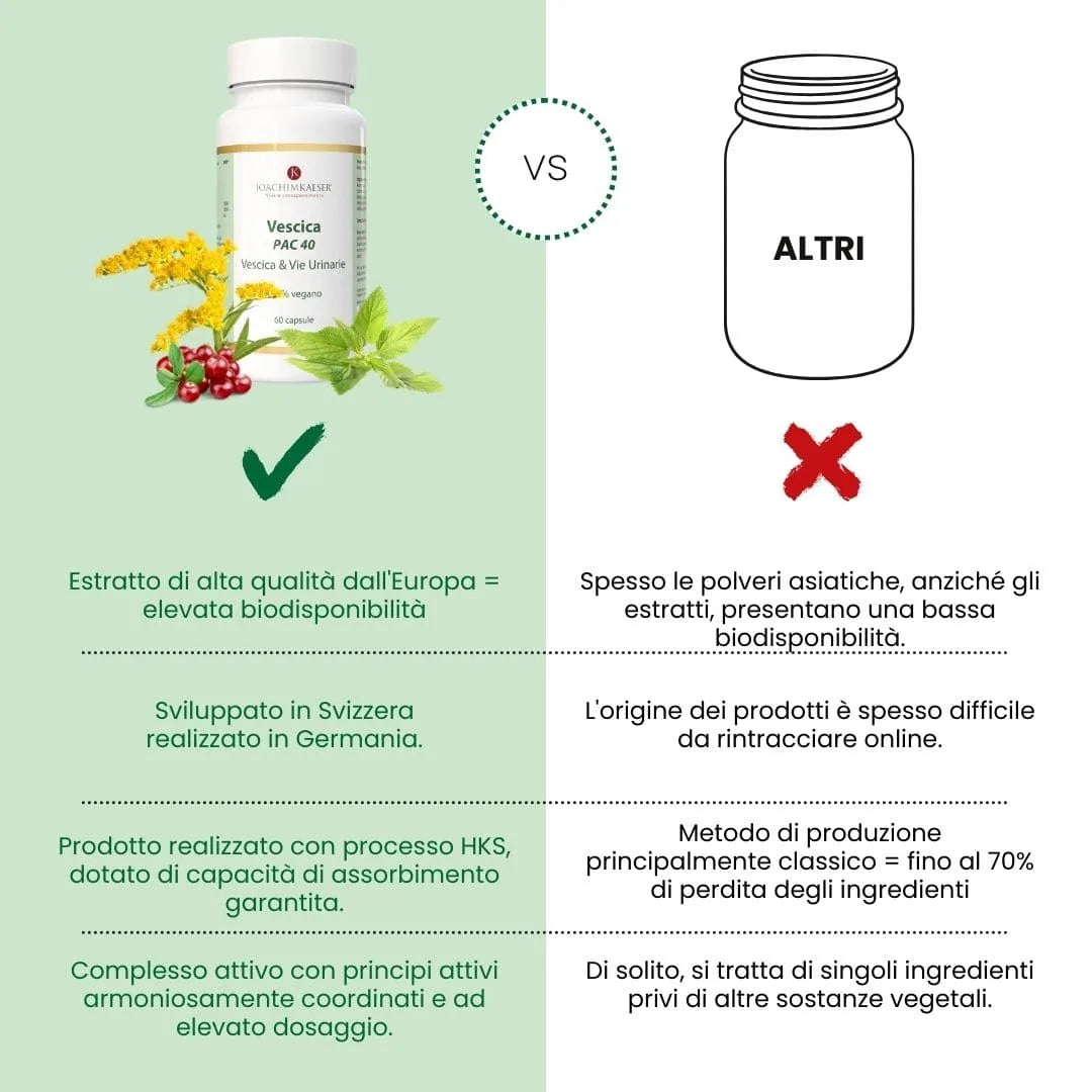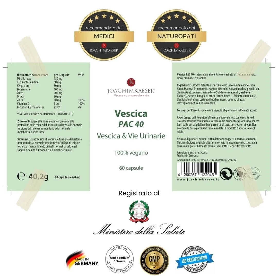 Blase PAC40 kombiniert Cranberry, D-Mannose, Kürbiskerne und Pflanzenextrakte mit Vitamin D3, Zink und Probiotika.
