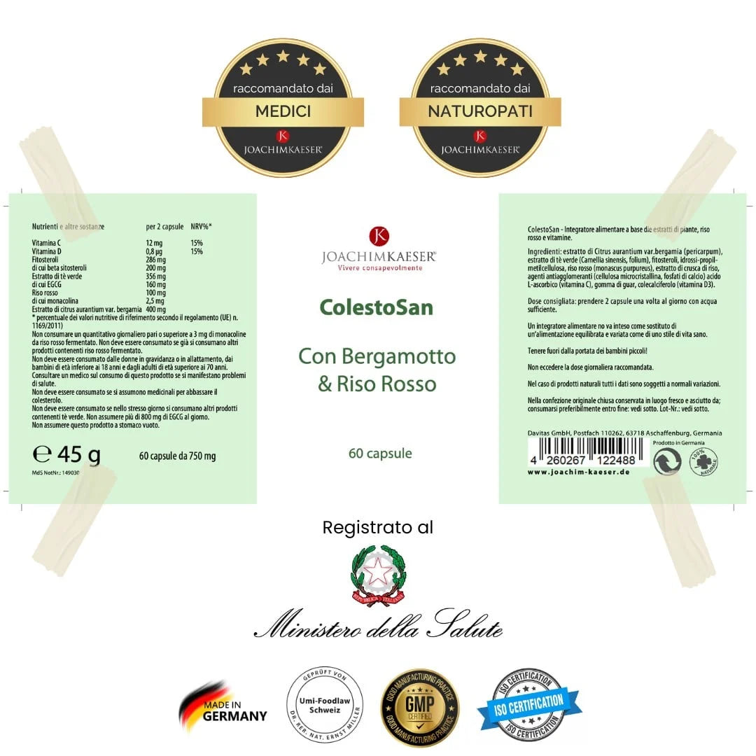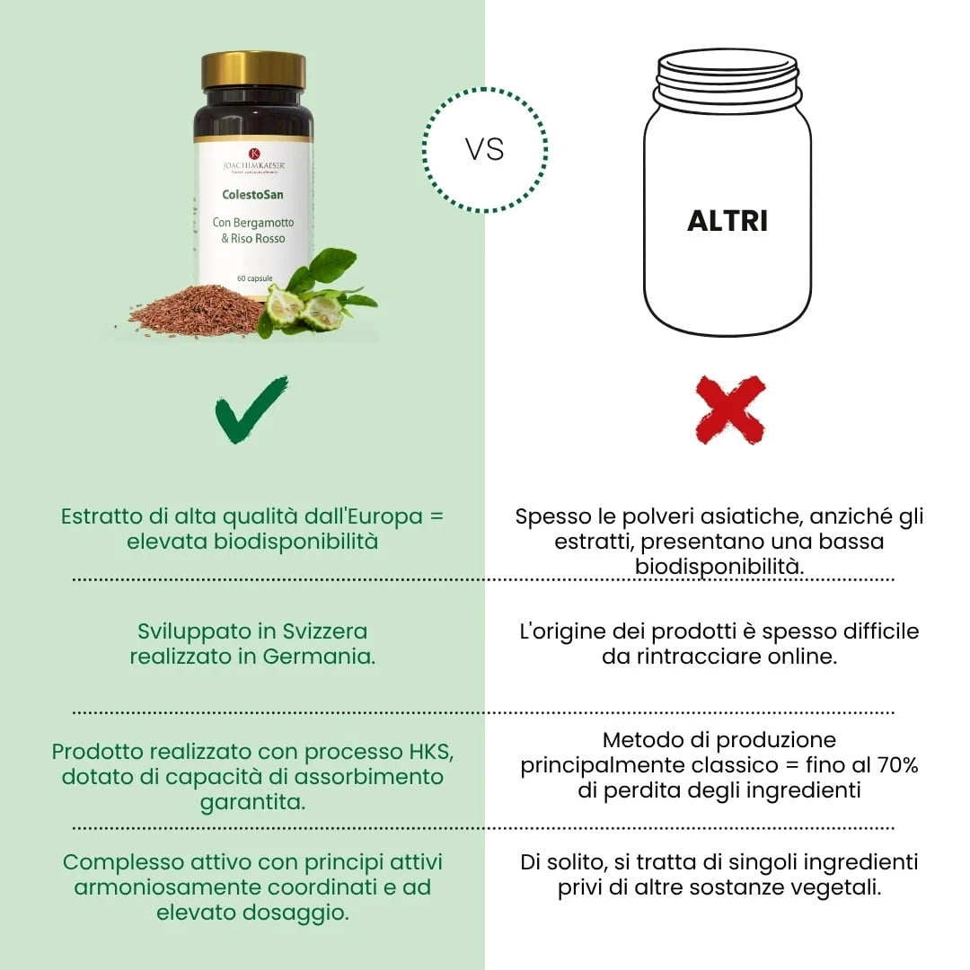 ColestoSan enthält spezielle natürliche Wirkstoffe, die zur Aufrechterhaltung eines normalen Cholesterinspiegels und zur Unterstützung des Fettstoffwechsels beitragen. Die kombinierte Wirkung von pflanzlichen Phytosterolen , fermentiertem rotem Reis , Bergamottenextrakt und Grüntee (EGCG) bietet synergistische und effektive Unterstützung.