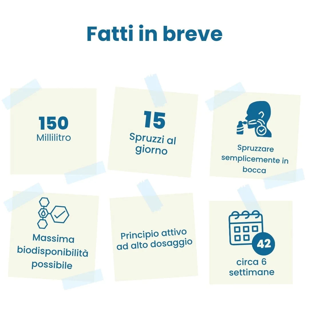 Sprühen Sie einmal täglich 15 Sprühstöße direkt unter die Zunge oder direkt auf die Haut. Überschreiten Sie nicht die empfohlene Tagesdosis.