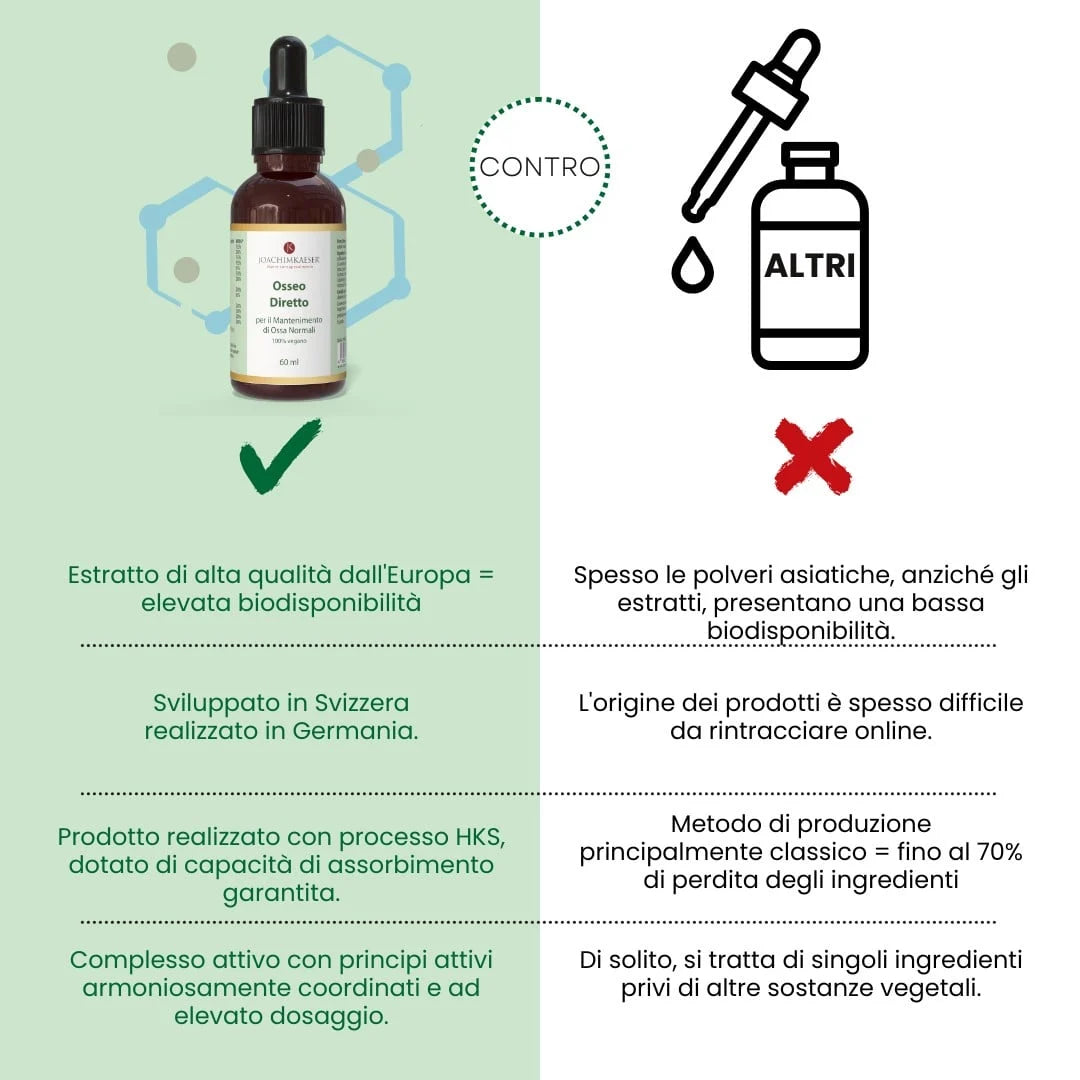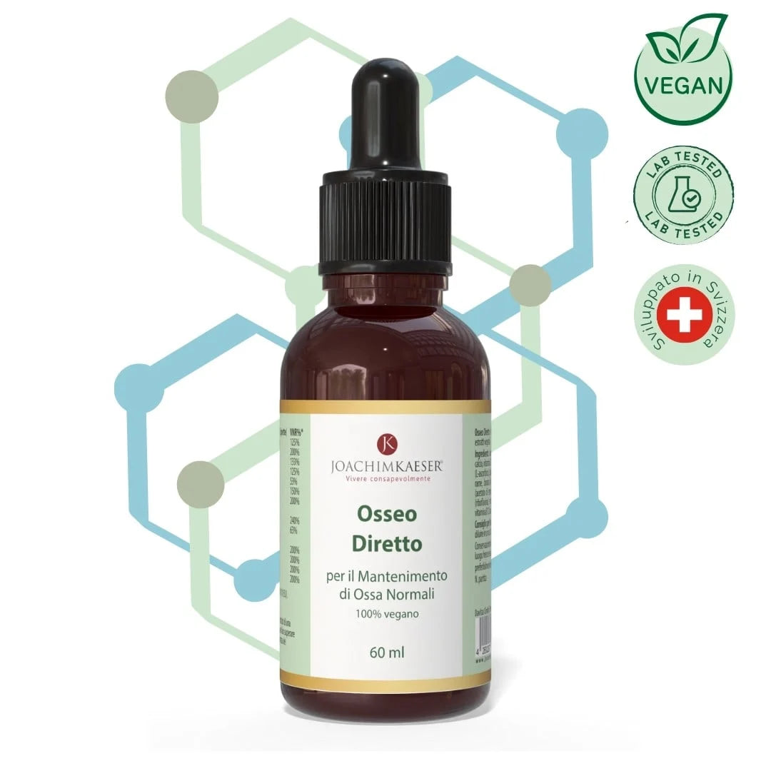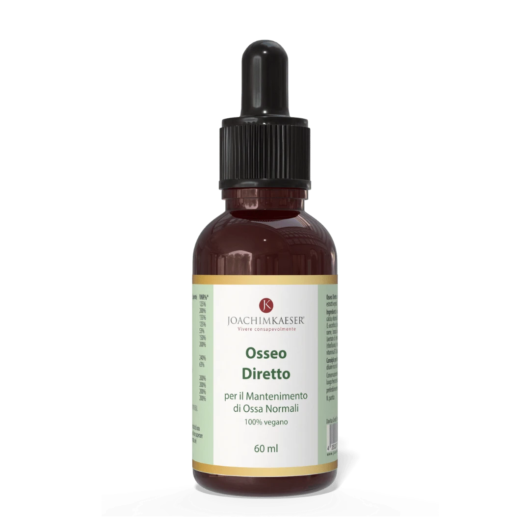 Osseo Direct ist ein flüssiges Nahrungsergänzungsmittel, das Kalzium, Magnesium, Zink, Kupfer, Mangan und Bor mit wichtigen Vitaminen wie D3, K2, C, A, B2, B6, B12 und Folsäure in kolloidaler Form für eine hohe Bioverfügbarkeit kombiniert.