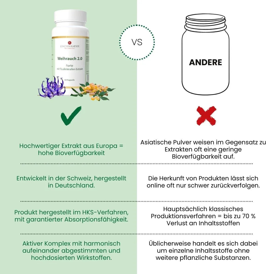Das Verbrennen von Räucherstäbchen hat lediglich eine aromatische Wirkung. Weihrauch 2.0 wirkt innerlich mit einem konzentrierten und standardisierten Extrakt, dessen Wirksamkeit durch wissenschaftliche Studien belegt ist.
